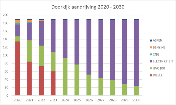 Verder volgen we het eerder gemaakte plan voor de vervangingsmomenten van onze voertuigen tot aan 2030, waarbij we de verwachte, meest duurzame voertuigen kopen die via normale voertuigdealers te koop zijn. In dit ambitieuze scenario zou in 2025 60% van de vloot elektrisch aangedreven kunnen zijn en in 2030 zelfs meer dan 80%. Daarmee anticiperen we op de invoering van een zero-emissie zone in een groot aantal stadscentra per 2025.